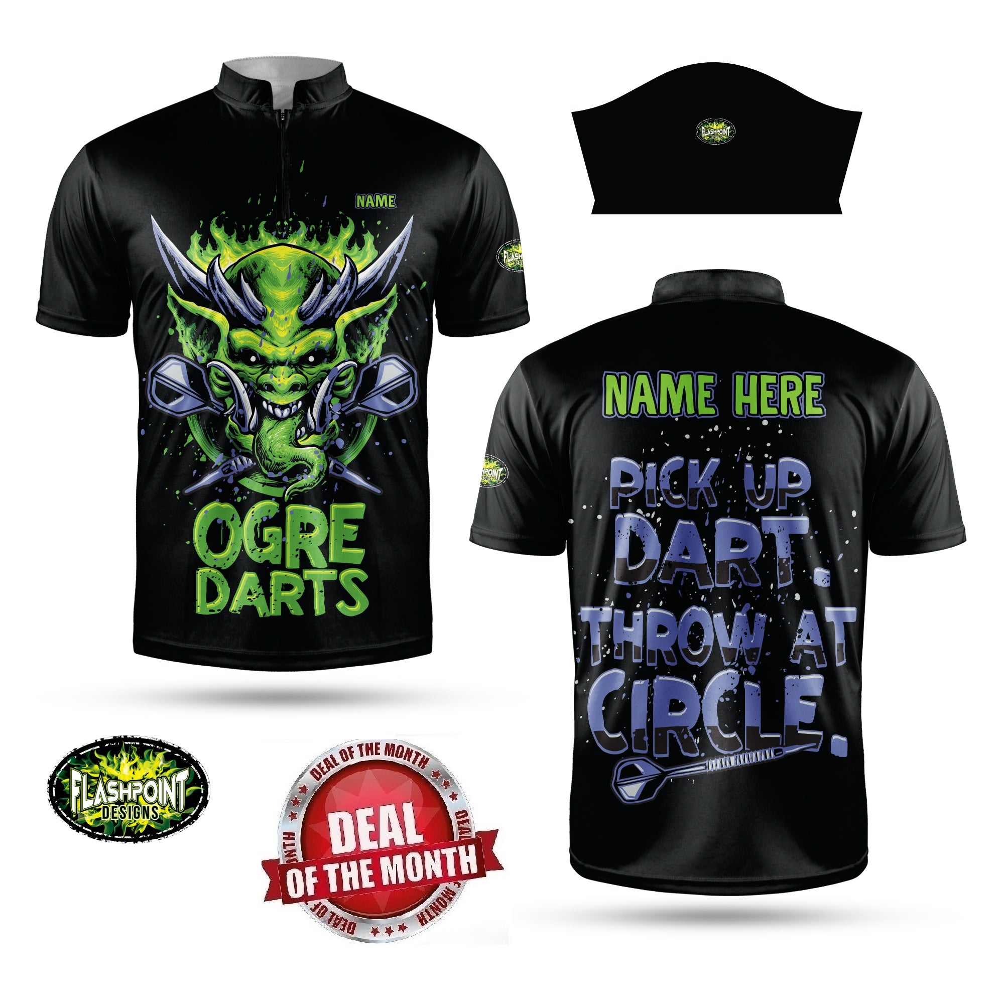 For the Month of December we offer our Awesome Design "Ogre Darts" Jersey at the special price of only $44.99 with Free Shipping and Free Personalization. As an added Bonus if you add Any of either our MASTER THE AIM PURPLE REAPER - you will get the Master The Aim Jersey for only $36.00. That is two jerseys for $80.99 with free personalization, free pockets (you can get with or without - same price), and free shipping!